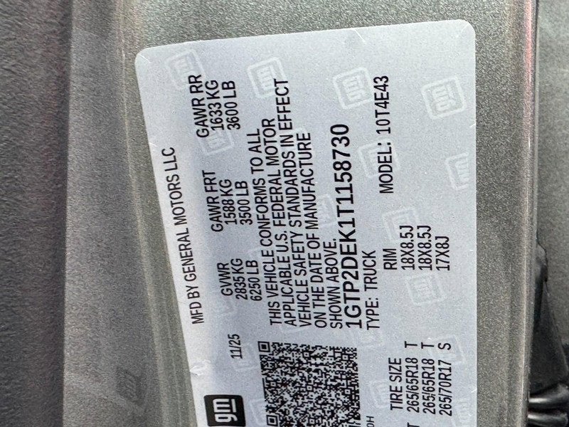 Sterling 2026 GMC Canyon AT4 2.7L I4 Turbocharged DOHC 16V LEV3-SULEV30 310hp 8-Speed Automatic 4WD 4D Crew Cab 4WD, 120-Volt Bed Mounted Power Outlet, 2 1st Row USB Charge/Data Ports, 2 Rear USB Ports in Center Console (Charge-Only), 3.42 Rear Axle Ratio, 4-Way Manual Front Passenger Seat Adjuster, 4-Wheel Disc Brakes, 6 Speakers, 6-Speaker Audio System Feature, 8-Way Power Driver Seat Adjuster, ABS brakes, Air Conditioning, Alloy wheels, AM/FM radio: SiriusXM with 360L, Apple CarPlay/Android Auto, Auto High-beam Headlights, Auto-dimming Rear-View mirror, Automatic Emergency Braking, Automatic Stop/Start, Automatic temperature control, Blind Zone Steering Assist with Trailering, Brake assist, Bumpers: body-color, Canyon Pro Safety, Canyon Safety Plus Package, Cloth/CoreTec Seat Trim, Compass, Delay-off headlights, Driver and Front Passenger Illuminated Visors, Driver door bin, Driver Mode Selector, Driver vanity mirror, Dual front impact airbags, Dual front side impact airbags, Dual-Zone Automatic Climate Control Air Conditioning, Electronic Stability Control, Emergency communication system: OnStar, EZ-Lift and Lower Tailgate, Following Distance Indicator, Forward Collision Alert, Front anti-roll bar, Front Bucket Seats, Front Center Armrest, Front dual zone A/C, Front fog lights, Front LED Fog Lamps, Front Passenger Seatback Map Pocket, Front Pedestrian and Bicyclist Braking, Front reading lights, Front wheel independent suspension, Heated door mirrors, Heated Driver and Front Passenger Seats, Heated front seats, Illuminated entry, Inside Rear-View Auto-Dimming Mirror, IntelliBeam Automatic High Beam on/Off, Interior Overhead Courtesy Light with Dual Reading Lamp, Lane Keep Assist with Lane Departure Warning, Low tire pressure warning, MultiStow Tailgate Storage Compartment, Navigation System, Occupant sensing airbag, Off-Road Suspension, Outside temperature display, Overhead airbag, Overhead console, Panic alarm, Passenger door bin, Passenger vanity mirror, Power door mirrors, Power Driver Lumbar Control Seat Adjuster, Power driver seat, Power steering, Power windows, Radio data system, Radio: 11.3 Diagonal Premium GMC Infotainment System, Rear Cross Traffic Braking, Rear of Console 120-Volt Power Outlet, Rear reading lights, Rear step bumper, Rear window defroster, Remote keyless entry, Remote Vehicle Starter System, Security system, SiriusXM with 360L, Speed control, Speed-sensing steering, Split folding rear seat, Steering wheel mounted audio controls, Stop/Start System Disable Button Engine Control, Tachometer, Tailgate Keyed Cylinder Lock, Telescoping steering wheel, Til and Telescopic Manual Steering Column, Tilt steering wheel, Traction control, Trip computer, Ultrasonic Rear Park Assist, Variably intermittent wipers, Wheels: 18 x 8.5 Gloss Black Aluminum, Wireless Apple CarPlay/Wireless Android Auto, 4WD.