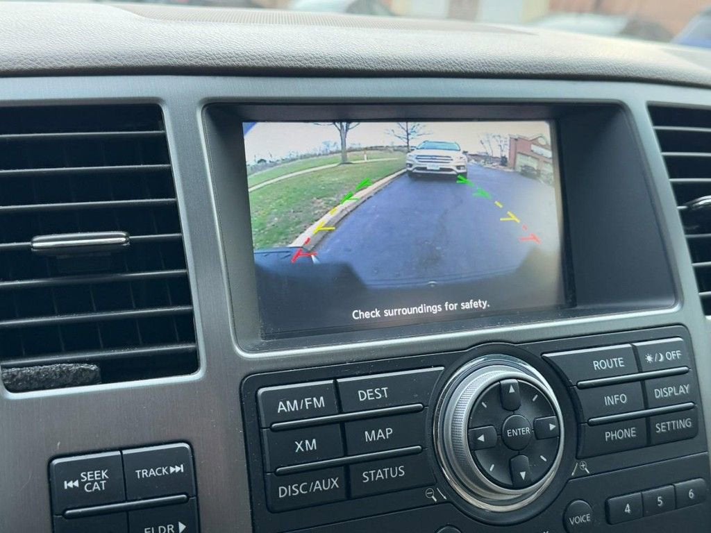 Recent Arrival! 2013 Nissan Armada Platinum 5.6L V8 DOHC 32V Endurance 5-Speed Automatic with Overdrive 4WD 4D Sport Utility Pearl White Metallic 4WD, 12 Speakers, 20 6-Spoke Chrome Clad Wheels, 3.357 Axle Ratio, 3rd row seats: split-bench, 4-Wheel Disc Brakes, A/V remote, ABS brakes, Adjustable pedals, Air Conditioning, Alloy wheels, AM/FM radio: SiriusXM, Anti-whiplash front head restraints, Auto-dimming door mirrors, Auto-dimming Rear-View mirror, Auto-leveling suspension, Automatic temperature control, Bodyside moldings, Brake assist, Bumpers: body-color, CD player, Compass, Delay-off headlights, Driver door bin, Driver vanity mirror, Driver's Seat Mounted Armrest, Dual front impact airbags, Dual front side impact airbags, Electronic Stability Control, Exterior Parking Camera Rear, Floor & Cargo Mats (5-Piece Set), Four wheel independent suspension, Front anti-roll bar, Front Bucket Seats, Front Center Armrest, Front dual zone A/C, Front fog lights, Front reading lights, Fully automatic headlights, Garage door transmitter: HomeLink, Headphones, Heated door mirrors, Heated Front Bucket Seats, Heated front seats, Heated rear seats, Heated steering wheel, Illuminated entry, Leather Shift Knob, Leather-Appointed Seat Trim, Low tire pressure warning, Memory seat, Navigation System, Occupant sensing airbag, Outside temperature display, Overhead airbag, Overhead console, Panic alarm, Passenger door bin, Passenger seat mounted armrest, Passenger vanity mirror, Pedal memory, Power door mirrors, Power driver seat, Power Liftgate, Power moonroof, Power passenger seat, Power steering, Power windows, Radio data system, Radio: HDD Navigation w/Voice Recognition, Rear air conditioning, Rear anti-roll bar, Rear reading lights, Rear seat center armrest, Rear window defroster, Rear window wiper, Reclining 3rd row seat, Remote keyless entry, Roof rack, Security system, Speed control, Speed-sensing steering, Speed-Sensitive Wipers, Split folding rear seat, Steering wheel mounted audio controls, Tachometer, Tilt steering wheel, Traction control, Trip computer, Turn signal indicator mirrors, Variably intermittent wipers, Voltmeter, 4WD.