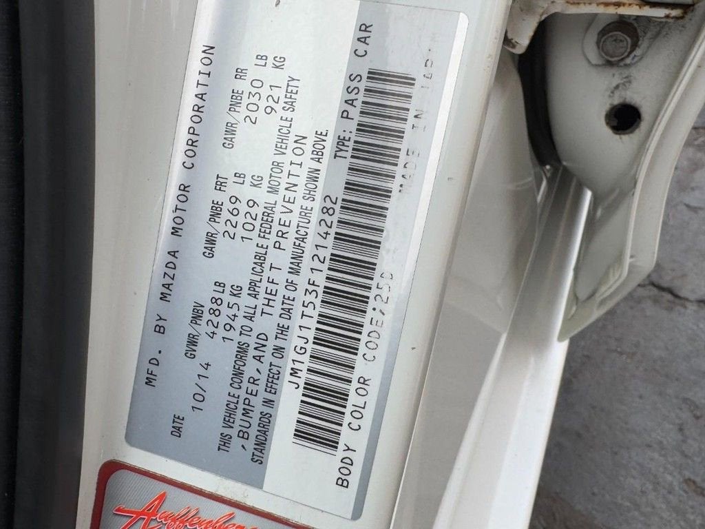2015 Mazda Mazda6 i Touring SKYACTIV®-G 2.5L I4 DOHC 16V 6-Speed Sport Automatic FWD 4D Sedan Snowflake White Pearl Mica 4-Wheel Disc Brakes, 6 Speakers, ABS brakes, Air Conditioning, Alloy wheels, AM/FM radio, Anti-whiplash front head restraints, Automatic temperature control, Brake assist, Bumpers: body-color, CD player, Delay-off headlights, Driver door bin, Driver vanity mirror, Dual front impact airbags, Dual front side impact airbags, Electronic Stability Control, Exterior Parking Camera Rear, Four wheel independent suspension, Front anti-roll bar, Front Bucket Seats, Front Center Armrest, Front dual zone A/C, Front reading lights, Illuminated entry, Leather Shift Knob, Leatherette Seat Trim, Low tire pressure warning, Occupant sensing airbag, Outside temperature display, Overhead airbag, Overhead console, Panic alarm, Passenger door bin, Passenger vanity mirror, Power door mirrors, Power driver seat, Power steering, Power windows, Radio data system, Radio: AM/FM/CD/MP3/AUX 6-Speaker Audio & HD Radio, Rear anti-roll bar, Rear reading lights, Rear seat center armrest, Rear window defroster, Reclining Front Sport Bucket Seats, Remote keyless entry, Snowflake White Pearl Mica Paint Charge, Speed control, Speed-sensing steering, Split folding rear seat, Steering wheel mounted audio controls, Tachometer, Telescoping steering wheel, Tilt steering wheel, Traction control, Trip computer, Turn signal indicator mirrors, Variably intermittent wipers, Wheels: 19 x 7.5J Alloy.