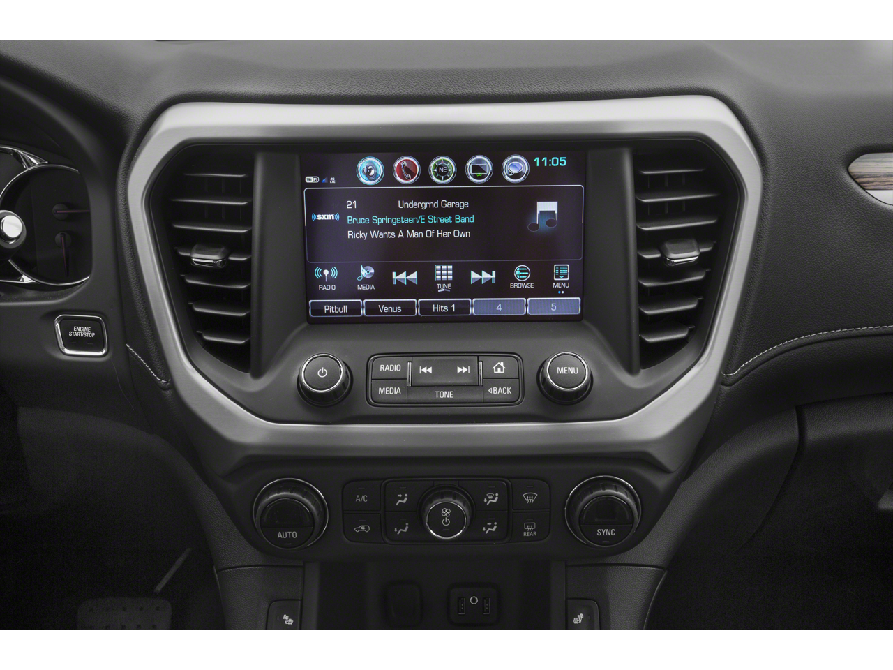 - Audio system, 8" diagonal Color Touch Screen Navigation with GMC Infotainment System, AM/FM/SiriusXM USB ports, auxiliary jack, Bluetooth® streaming audio for music and most phones, advanced phone integration featuring Apple CarPlay, Android Auto and voice-activated technology for radio and phone